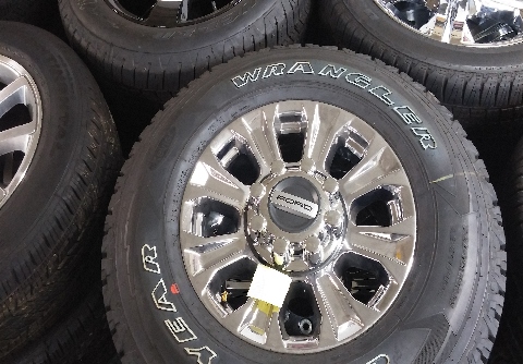 2018 F250 chrome 18" with LT275x70x18 Goodyear all terrain Adventure tires. These are "SNOW" rated with snowflake insignia. These are the newest CPVD coated wheels . Wheels ,tires , sensors, lugnuts $2000.00 plus taxes . Fits 2004 and newer |