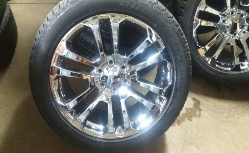 Hard Chrome 20" Reproduction chev/gmc wheels with dealer take off P275x55x20 Bridgestone deuller Alenza tires. Includes TPMs for 2007 thru 2019 or can change to newer. Also have sets with larger P275x60x20 tires for newer trucks $2600.00 plus taxes. |