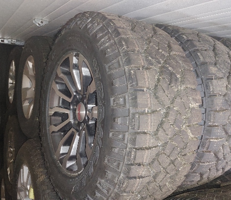 Brand new 18" GMC factory wheel. Fits Sierra, silverado, tahoe,escalade. Aggressive Goodyear 265x65x18 Dura trac tires. tires, TPMS sensors all new at $2400.00 plus taxes. Expensive tires. These are factory 18" for those who prefer not to go chrome. |